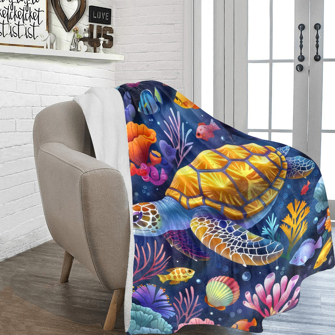 Dive into cozy comfort with our Enchanting Undersea Turtle Micro Fleece Blanket! This isn't just a blanket; it's a hug of warmth featuring a vibrant underwater scene. A majestic sea turtle glides through a colorful coral reef, surrounded by playful fish, bringing a touch of the ocean's magic to your home. Crafted from incredibly soft, high-quality polyester micro fleece, this blanket offers unparalleled comfort and warmth. Perfect for snuggling on the couch, adding a splash of personality to your bedroom, or taking on adventures wherever you go. Available in multiple sizes, from a cozy throw to a generous bedspread, there's a perfect fit for everyone. Easy to care for and built to last, this blanket is a delightful addition to any home. Machine washable and tumble dry low.